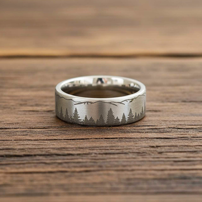 Available in brushed silver, gunmetal, or black finishes, this unconventional mountain & forest etched tree ring breaks free from the mundane designs at a typical jeweler. Detailed forest trees and mountain landscape encompass the entire ring! It's a unique mountain range ring that tells your story while celebrating your commitment to adventure and each other. The brushed silver finish against the tungsten creates depth and character that photographs simply can't capture. Rest easy knowing that your wedding band is protected with our comprehensive lifetime warranty.