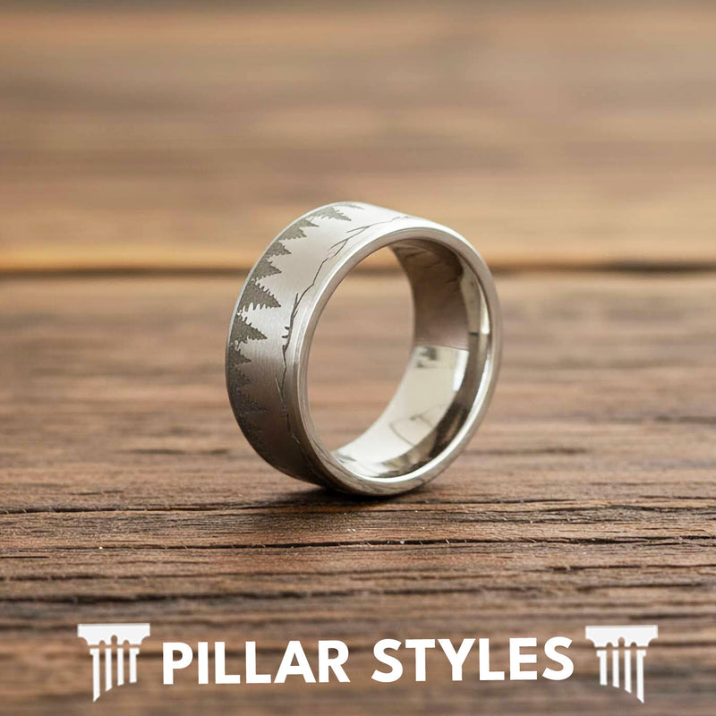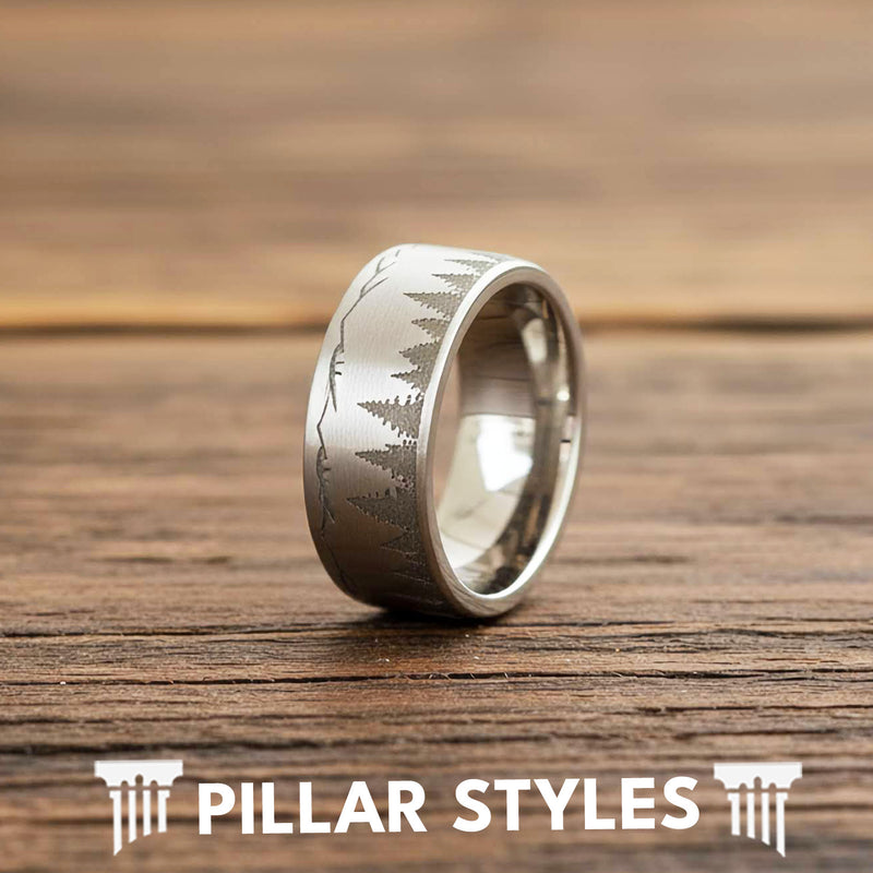 Introducing our silver nature-inspired wedding ring that’s bold, adventurous, and as unique as you are! This 8mm silver tungsten ring showcases a brushed finish with a forest tree and mountain landscape for a subtle, yet powerful look on your finger. The unique two-tone style in silver has been requested and it's worth the wait - no details are overlooked with this comfort fit tungsten ring. Every glance at the nature ring reveals new details in this intricate wilderness scene that practically comes alive in natural light. The captivating design is impossible to ignore and sure to catch the eye of others. It's a ring you'll be excited to wear! Plus, your silver mountain and forest tree ring includes a free ironclad lifetime warranty.